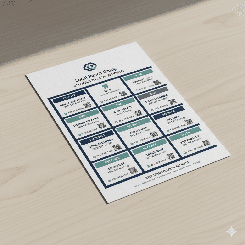 Local Reach Group runs neighborhood-level direct mail campaigns built for local businesses that want visibility without competing for attention. Each campaign features one business per industry and is distributed to targeted households within a specific zip code through USPS carrier routes. We keep campaigns simple, limited, and local, so businesses stand out where it matters most: in the neighborhoods that actually buy.